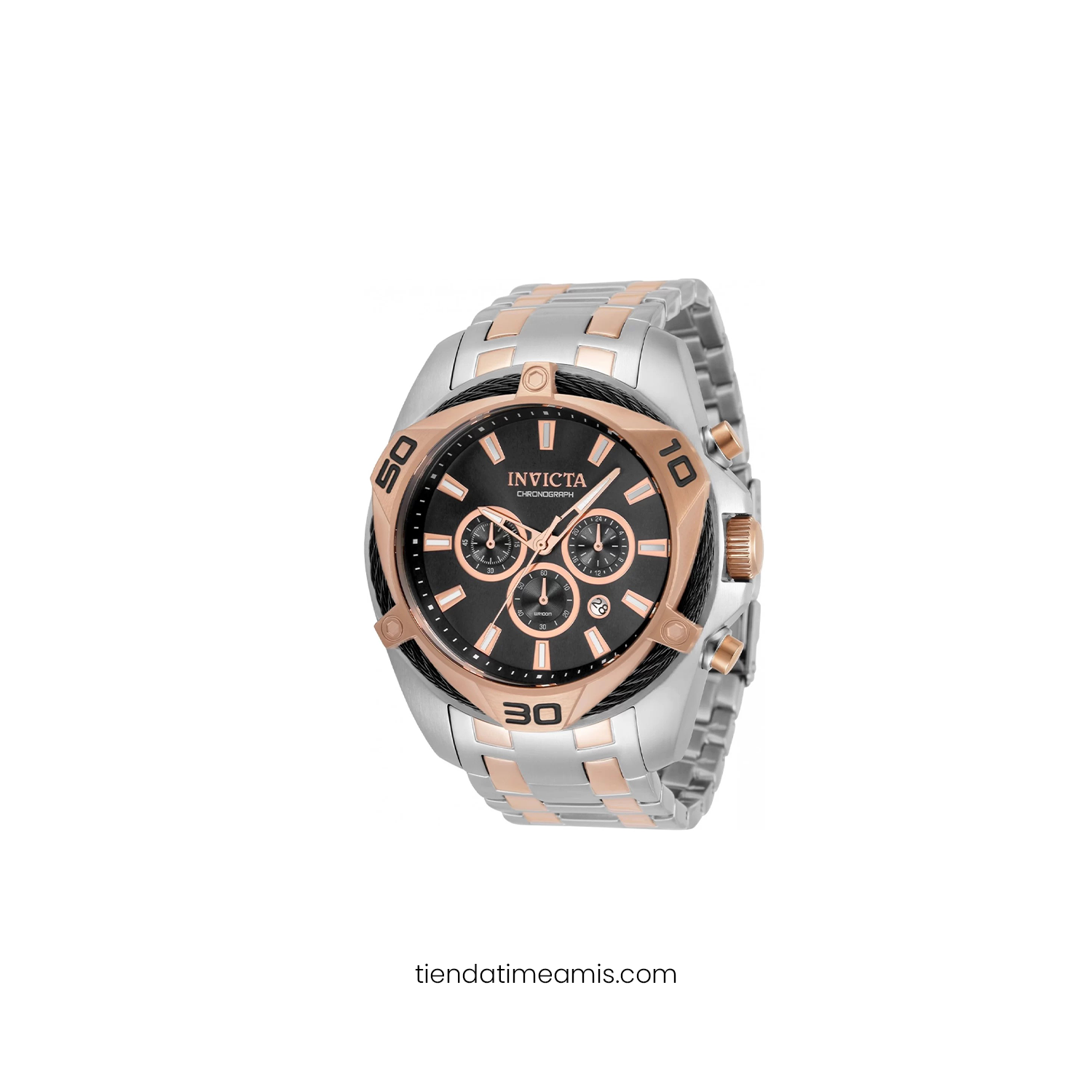Un cronógrafo robusto de gran presencia con una audaz mezcla de acero y detalles en rose gold, diseñado para destacar en cualquier plan.