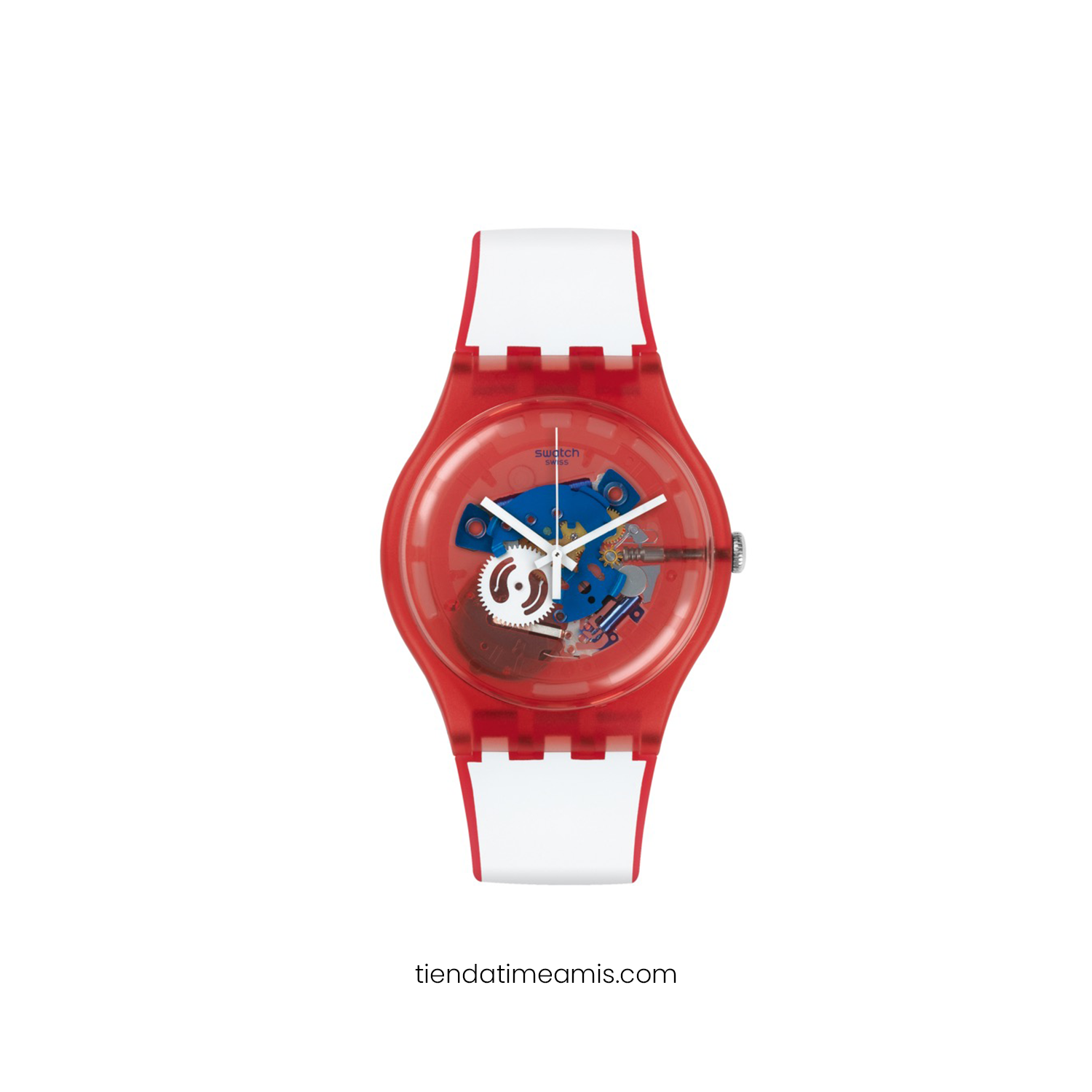 Reloj Swatch Clownfish Red SUOR102 con diseño vibrante inspirado en la paleta de colores del pez payaso que destaca por su combinación de rojo semitransparente blanco y detalles internos visibles ideal para quienes buscan un accesorio casual moderno con estilo llamativo para uso diario y outfits contemporáneos