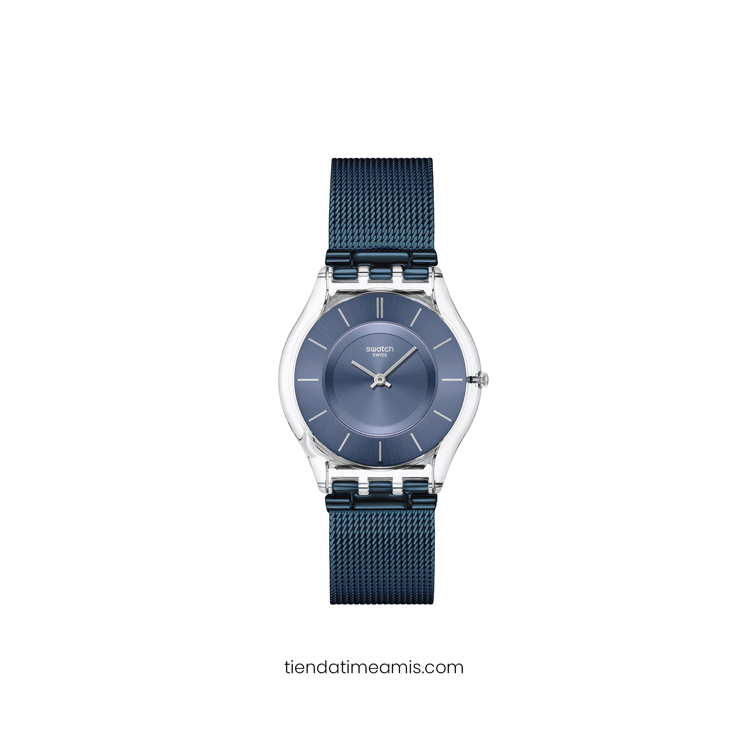 Reloj Swatch Cool Skies SS08K120M con diseño elegante y moderno que combina una estética sofisticada de tonos azules y detalles transparentes pensado para quienes buscan un accesorio estilizado y versátil ideal para el uso diario y looks contemporáneos