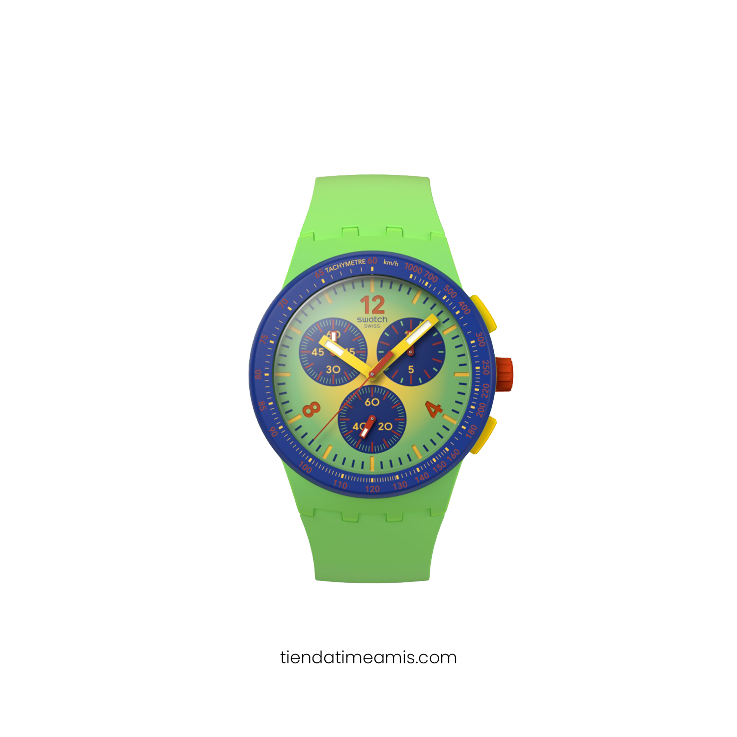 Reloj Swatch Flowing Freshly SUSG101 reloj unisex con diseño vibrante inspirado en degradados de color que combinan tonos verde claro amarillo y azul transmitiendo energía y dinamismo ideal para quienes buscan un accesorio moderno y expresivo tanto para el uso diario como para estilos casuales contemporáneos
