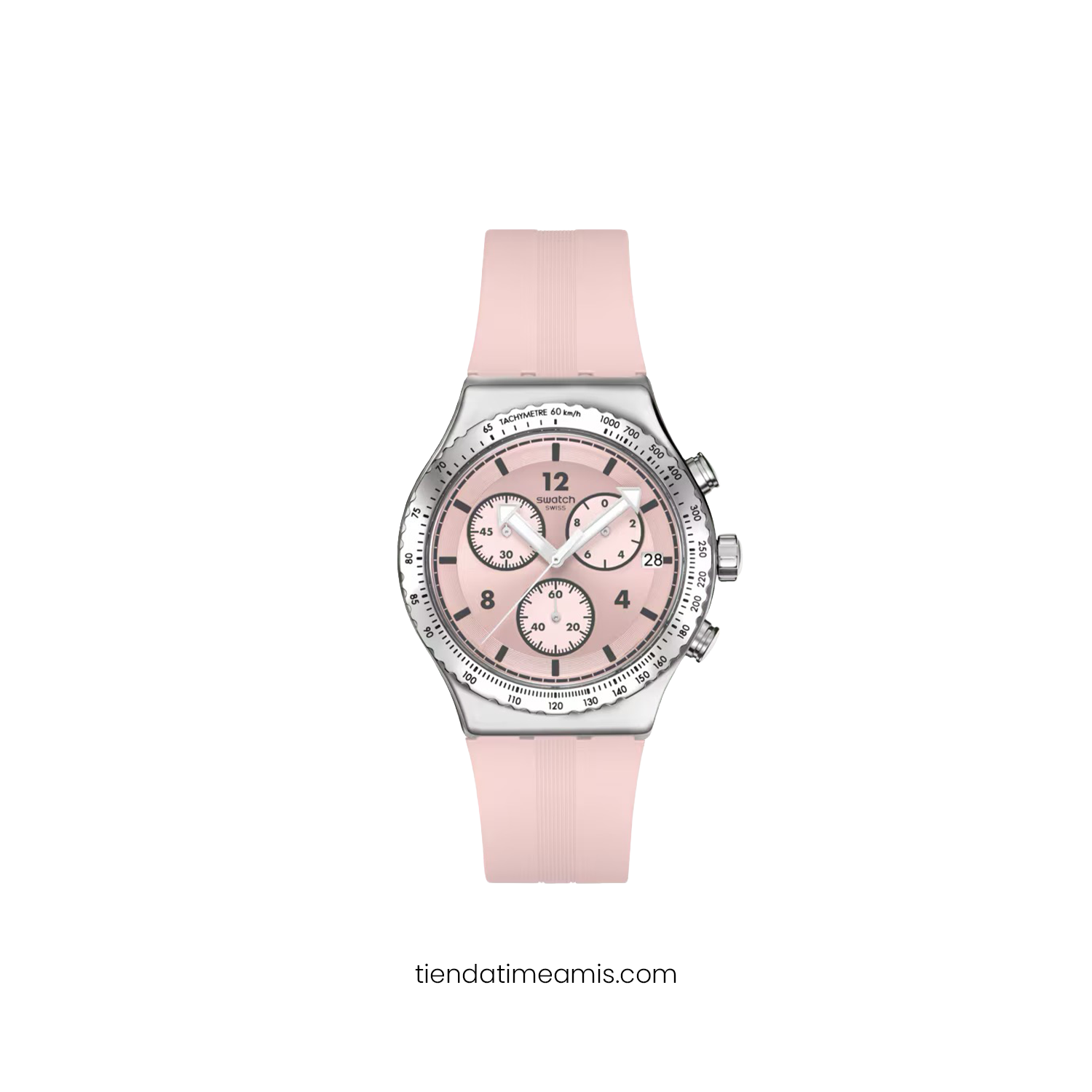 Reloj Swatch YVS532 conocido como Swatch Irony Chrono Poppingly Pink YVS532 con diseño moderno y audaz que combina una caja de acero inoxidable pulido con una esfera rosa vibrante cronógrafos visibles y detalles contemporáneos ideal para quienes buscan un accesorio funcional.